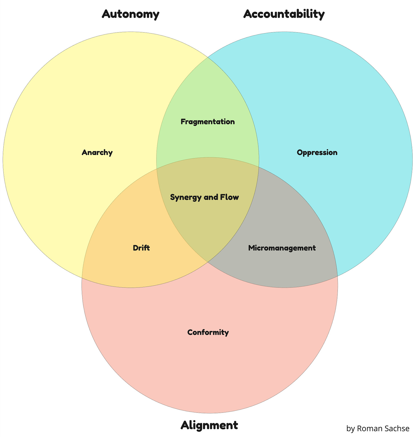 I hope I haven’t inadvertently "borrowed" this model from elsewhere, but aside from Kniberg’s approach, I couldn’t find a concept that explores these dependencies in the same way. Below, I outline the different configurations of Autonomy, Alignment, and Accountability and their respective impacts.